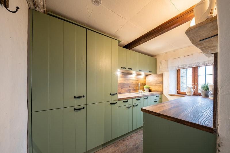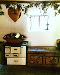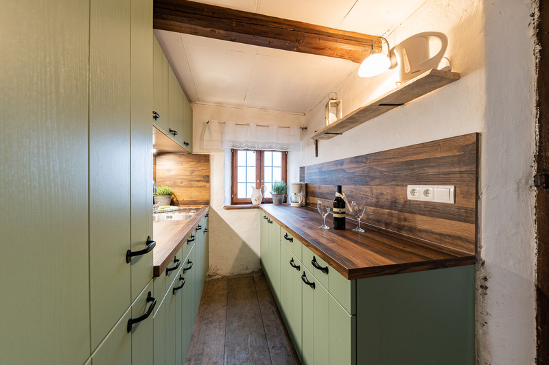 Die Küche ist mit einem Gasherd, Wasserkocher, Kaffeemaschine, Besteck & Gläser, etc. ausgestattet. Im Wohnbereich kann auch auf dem vorhanden Holzofen gekocht werden.