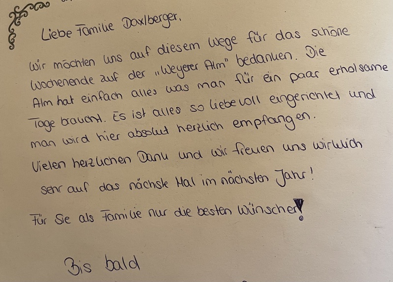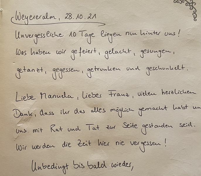Unsere Alm wurde bereits 1688 erbaut und befindet sich seither im Familienbesitz. Die mehrere jahrhundert alte Hütte mit Blick auf die Hochries liegt wunderschön abgelegen, ist aber dennoch in gut 30 Min. Fußmarsch ab dem Weyererhof erreichbar. Vom Parkplatz "Spatenau" beträgt die Gehzeit ca. 20 Minuten. Zudem ist der Weg bis zur Hütte mit dem Auto befahrbar.